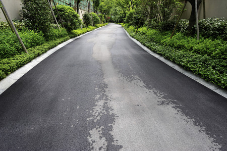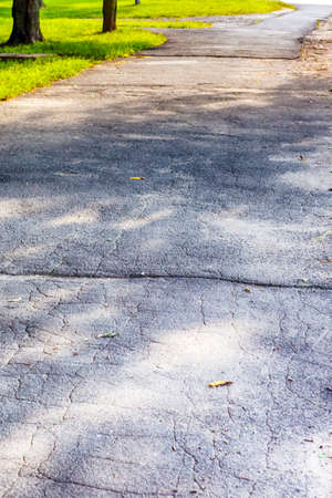 Abstract view of a road in a park with white road lines crossing straight on the right side of the image. Can be used in traffic or background applications.