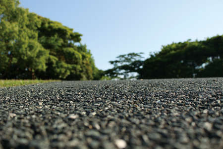 Top view of empty road texture with straight lines in white line on road. There are beautiful trees and stone pile on the side of the road, Light that shines through the tree makes sense of loneliness. Selective focus.