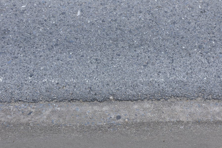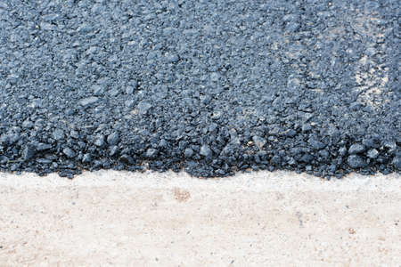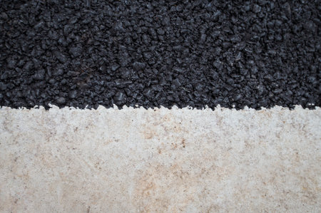 This image showcases a close-up view of asphalt, displaying textures and contrasts. Dark, granular material borders a smoother, lighter surface. The composition highlights details, suggesting outdoor settings or construction contexts. Suitable for various applications, including design, illustration, and commercial purposes.