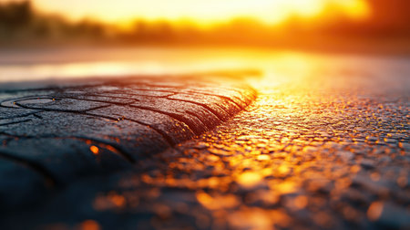 A stunning close-up image of tire tread illuminated by the warm glow of a sunset, resting on a wet road. The scene captures the beauty of nature and the intricate details of the tire's texture.