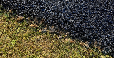 Close-Up of Textured Asphalt Edge with Grass and Leaves