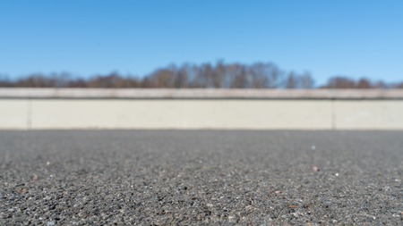 concrete fence asphalt road with treetops in the background. template for the desktop