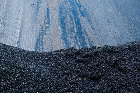 Repair of the road surface. A pile of stones made of old asphalt lies on the road. Textured abstract background. Close-up