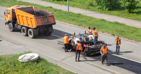 Road construction. Applying new hot asphalt using road construction machinery and power industrial tools. Roadworks repaving process.