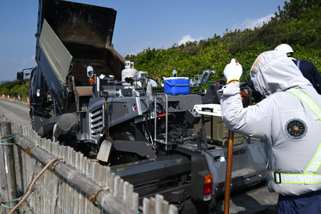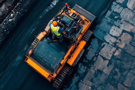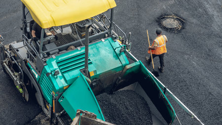 Workers operate heavy machinery on a bright day, laying fresh asphalt on a busy road with construction tools and vibrant activity highlighting progress.