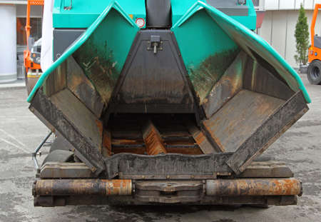 Asphalt paving equipment. Professional asphalt paver close-up. Construction of new roads and road junctions. Heavy construction industrial machinery