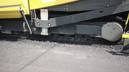 Industrial pavement machine laying fresh asphalt on street