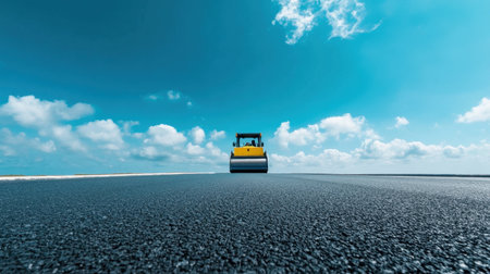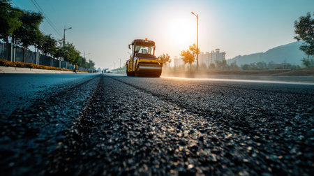 A heavy machinery roller works efficiently on a freshly laid asphalt road, showcasing the smooth surface under a bright sun, symbolizing modern infrastructure development.