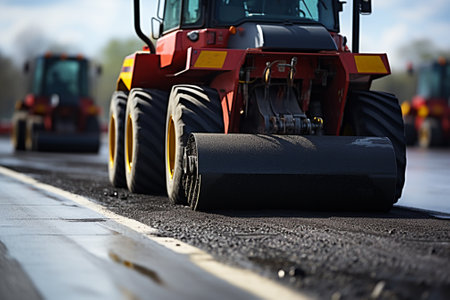 An asphalt roller in action, paving a new road, with fresh black asphalt being compressed under its heavy wheels. High quality photo
