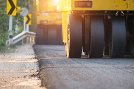 Close up on the yellow road roller working on the new road construction site. black asphalt road in the country, Road construction works with roller compactor machine and asphalt finisher,copy space