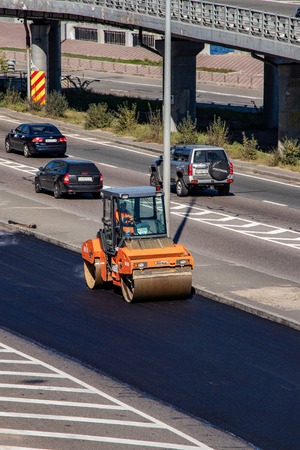 KYIV, UKRAINE - September 10, 2020: Heavy asphalt road roller with heavy vibration roller compactor that press new hot asphalt on the roadway on a road construction site on a street.
