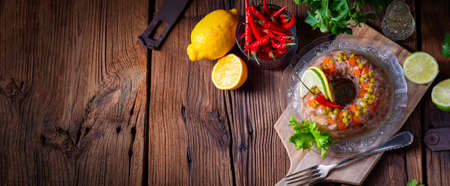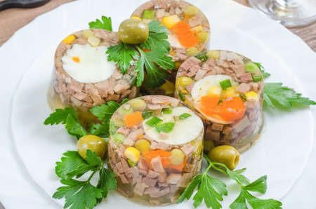 Aspic. Dish of chilled meat broth with meat and vegetables. Traditional national dish of Ukrainian cuisine. Holiday food. Jellied beef. For food blog, restaurant, cafe, menu, cookbook