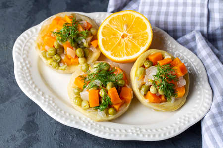 Vegetable tartlets stuffed with pumpkin, carrot, green peas and dill