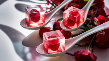 Three small cubes of ice with raspberries in them on a spoon, AI