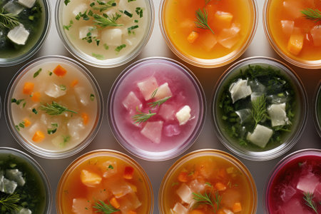 A close-up display showing a delightful variety of colorful soups prepared with vegetable broth, presenting an enticing and nutritious visual ideal for food and wellness-related projects.
