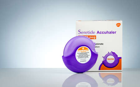 CHONBURI, THAILAND-NOVEMBER 28, 2018 : Seretide Accuhaler and packaging. Asthma accuhaler for treatment asthma. Bronchodilator and steroids drug for severe asthma. Medical device. Steroids inhaler.