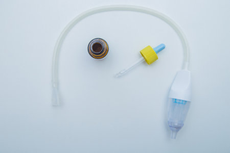 The childrens aspirator lies in a semicircle on a white background, inside it are drops from a runny nose with a pipette. . High quality photo