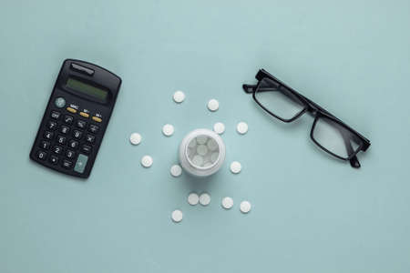 Economic calculation of the cost of treatment, analysis of the cost of medicines. Bottle of pills, calculator, glasses on blue background. Top view