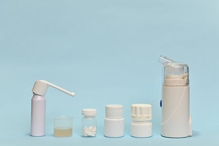 female hand in blue disposable medical glove holds containers with medication for inhalation, blue background copy space, treatment of asthma and bronchospasm, pulmonoligia concept