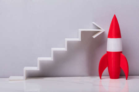 Red Rocket Near White Increasing Arrow Graph On Grey Background