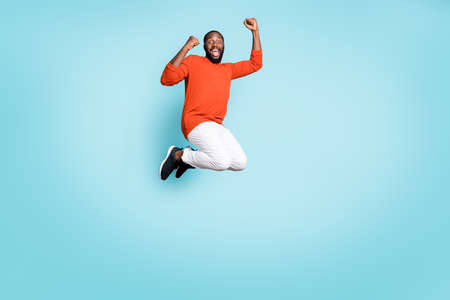 Full length body size photo of overjoyed crazy rejoicing black man wearing white mixed-race jump trousers pants sneakers expressing emotions on face isolated vivid blue color background