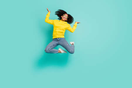 Full length body size view of nice funky cheerful wavy-haired girl jumping enjoying isolated over bright teal turquoise color background