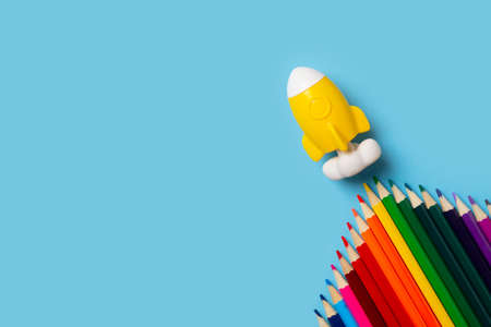Back to school theme with colorful pencils and rocket on blue background flat lay, top view, copy space