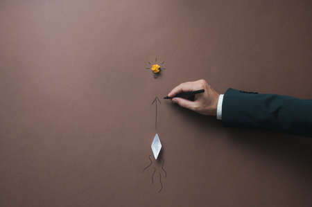 Businessman drawing an arrow towards a lightbulb for an origami made paper boat to follow in a conceptual image of vision and idea. Over brown background with copy space.