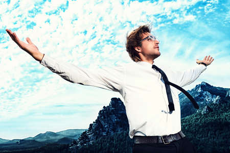 Happy businessman flying in the sky