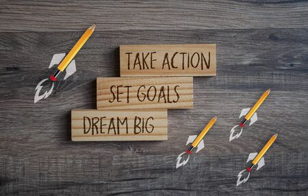 Wooden blocks with business terms Dream Big, set goals and take action on wooden background with rocket pencils