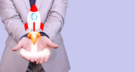 Startup concept with businessman holding and launching a rocket. Copy space. High quality photo