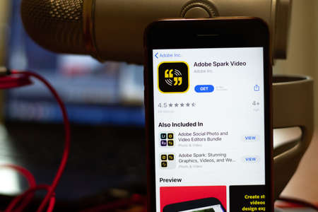 Los Angeles, California, USA - 16 April 2020: Adobe Spark Video logo on screen close up. App store icon visible on phone display, Illustrative Editorial.