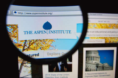 LISBON, PORTUGAL - FEBRUARY 6, 2014: Photo of The Aspen Institute homepage on a monitor screen through a magnifying glass.