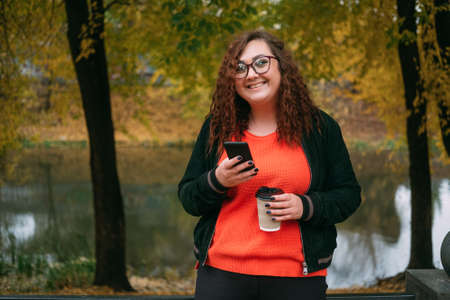 Enjoying walk. Happy woman. Mobile connection. Body positive. Friendship communication. Smiling plus size lady in sportive clothes cup coffee smartphone in park autumn season.