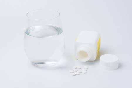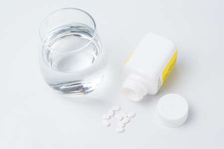 Pills and glass of water on blue background. Medicine, healthcare concept.