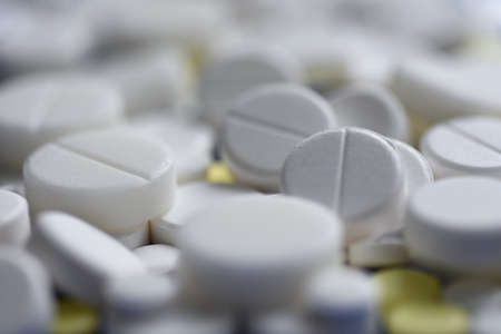 Close up view of heap of white pills with blurred white background