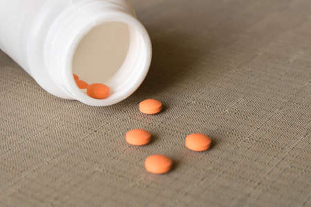 Pills for the treatment of human diseases. medicines in a white jar. medicines on an orange background. virus, covid