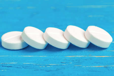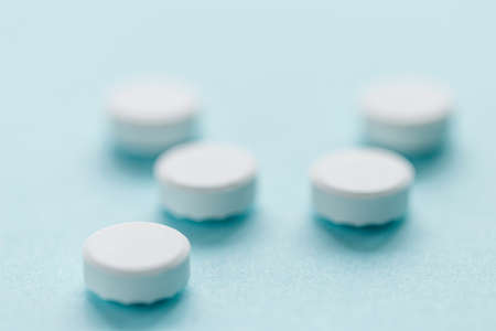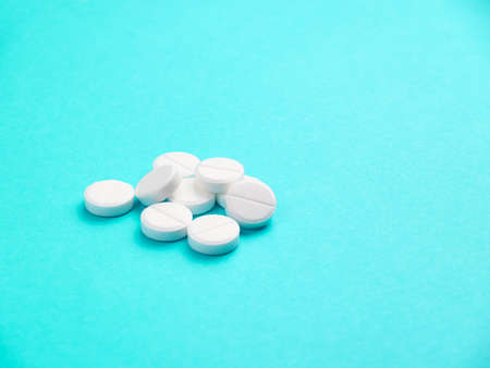 White pills antibiotic round on blue background