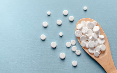 Close-up white pills, tablets in wooden spoon on blue table. Medicine and health concept. pharmaceutics. Top view. Pills and vitamins