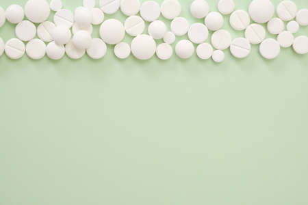 White pills on a green background. medical theme. selective focus. Side view of a pile of tablets.