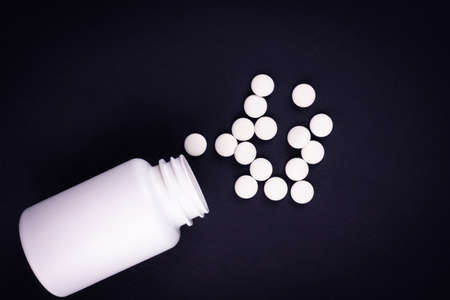 White pills medicine in bottle on a dark background