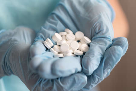 Closeup doctor or nurse hands in blue rubber gloves with handful pills. Medicine concept