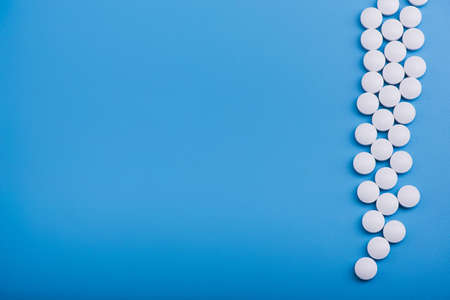 Round tablets arranged abstract isolated on blue color background. Pills for design. Concept of health, healthy lifestyle. Copy space for advertisement.