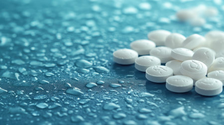 White tablets are scattered across a glossy blue surface glistening with droplets creating a fresh and clean aesthetic.