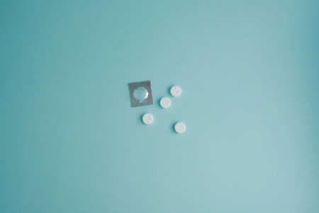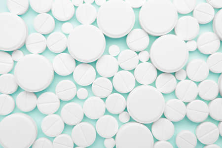 White medical pills, tablets and capsules from pharmacy on turquoise background. Macro top down view with copy space.