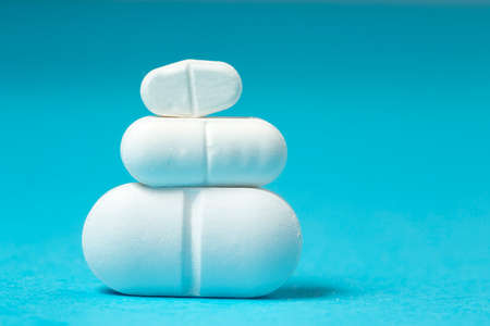white pills macro shot on blue background close up