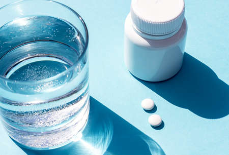 Tablets for the patient are on the table with water. A glass of water and white tablets on a blue background with harsh light and shadows. Creative. The concept of health