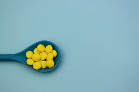 Yellow sweet drops in a blue spoon on a light blue background