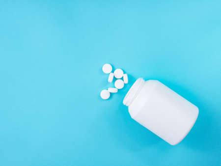 Medication bottle and white pills spilled on blue pastel colored background. Medication and prescription pills.