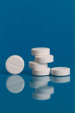 A column of pharmaceutical white pills on a bright blue background is reflected on a glass surface. Medicine concept. Minimalist style with colorful paper background. Trendy colors. Isolated.